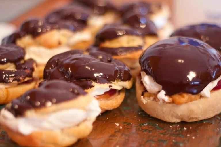 On the Monday, bakeries across Iceland produce enormous quantities of cream buns (bollur), traditionally choux pastry filled with cream and jam, topped with chocolate. Children make decorated cardboard paddles (bolluvendir) and playfully swat their parents while shouting "Bolla! Bolla! Bolla!" to earn more buns. Bakeries like Sandholt, Brauð & Co, and BakaBaka in Reykjavik offer dozens of variations, from classic to vegan to savoury.